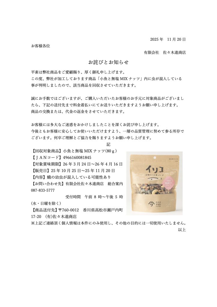 かがわ物産館 栗林庵で販売しております(有)佐々木進商店の「イリコ美味しい小魚シリーズ 小魚と無塩MIXナッツ」に虫が混入している可能性があることが判明いたしました。ご購入いただいたお客様にはご迷惑をおかけしたことを心からお詫び申しげます。