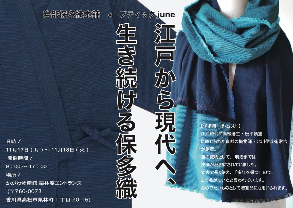 江戸時代から保多織を織り続ける老舗「岩部保多織本舗」と、保多織を現代のファッションとして提案する「ブティックjune」による共同出展です。岩部保多織本舗の伝統的な織物と、同店の生地を使った洋服や雑貨を並べ、保多織の魅力をご紹介します。