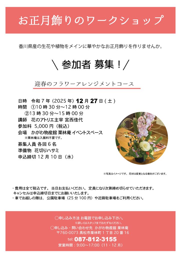 今回は香川県産の生花や植物をメインに使ったお正月飾りを作っていただく予定です。