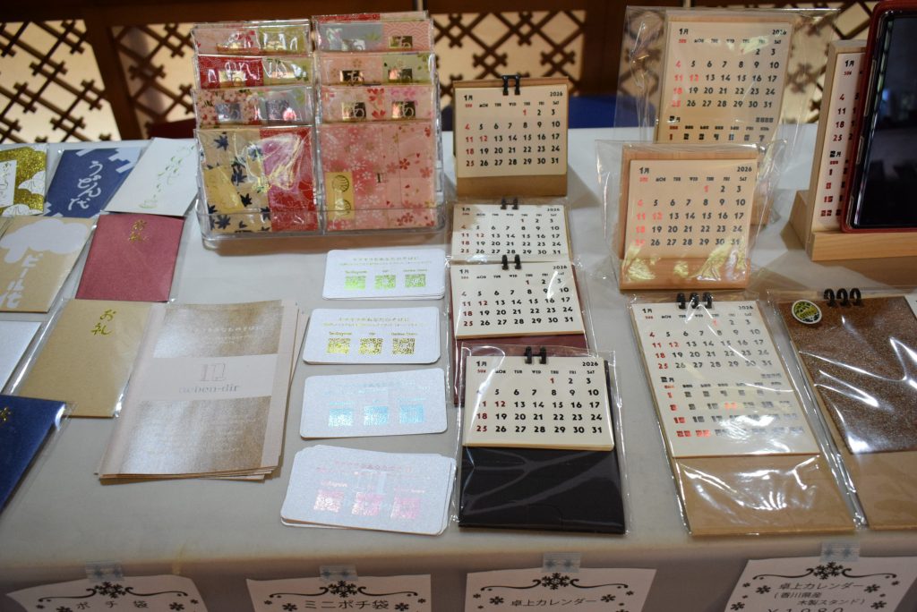 香川県のうどんをイメージしたデザインののし袋・ポチ袋、オリーブコルク(オリーブリーフ入り)を使用した卓上カレンダー等を販売します。今回、ミニ卓上カレンダーを置くタイプの木の台を新しく追加しました。(香川県産ヒノキ使用)