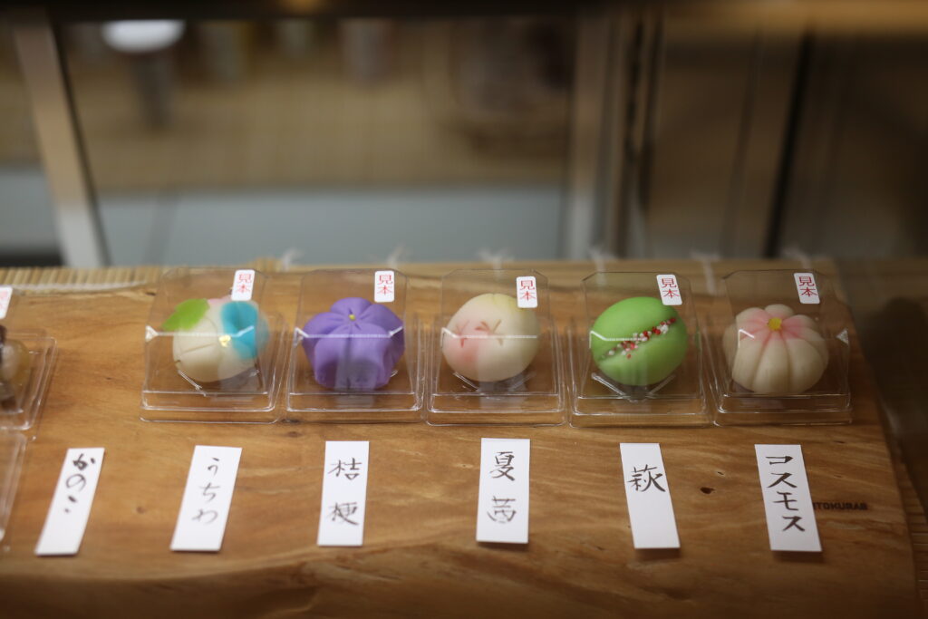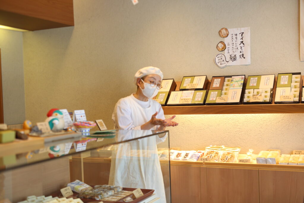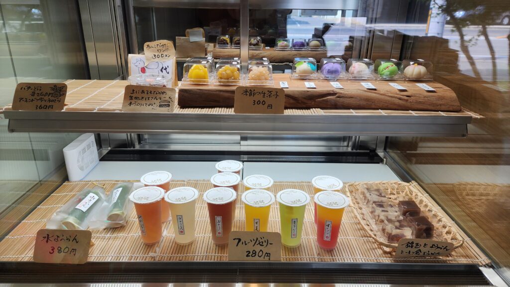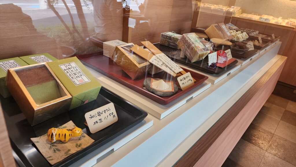 ショーケースにはかわいらしい季節の生菓子や「和三盆製 釜焼加寿貞良(かすてら)」などが並んでいます。