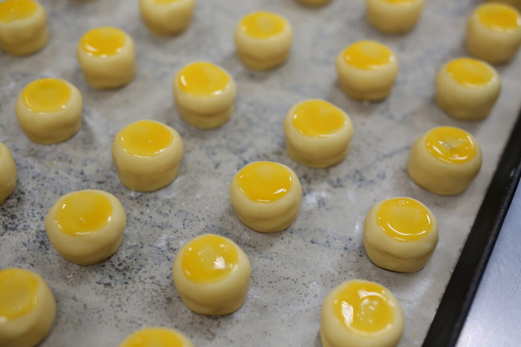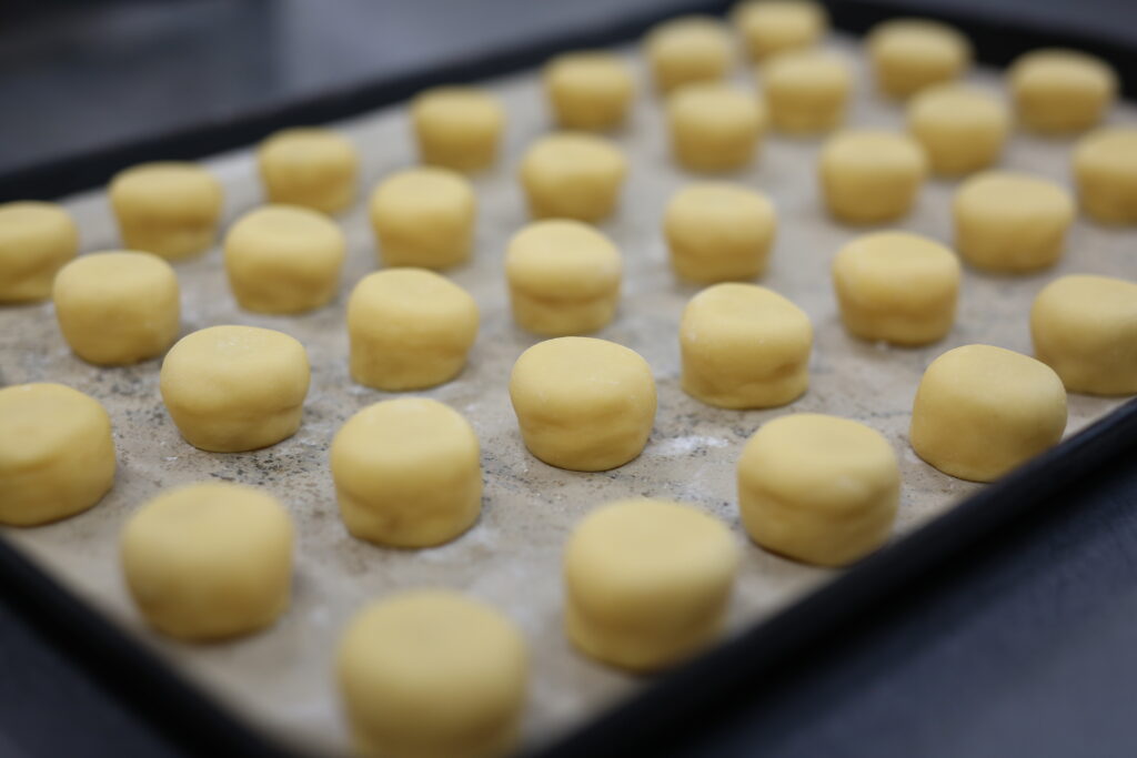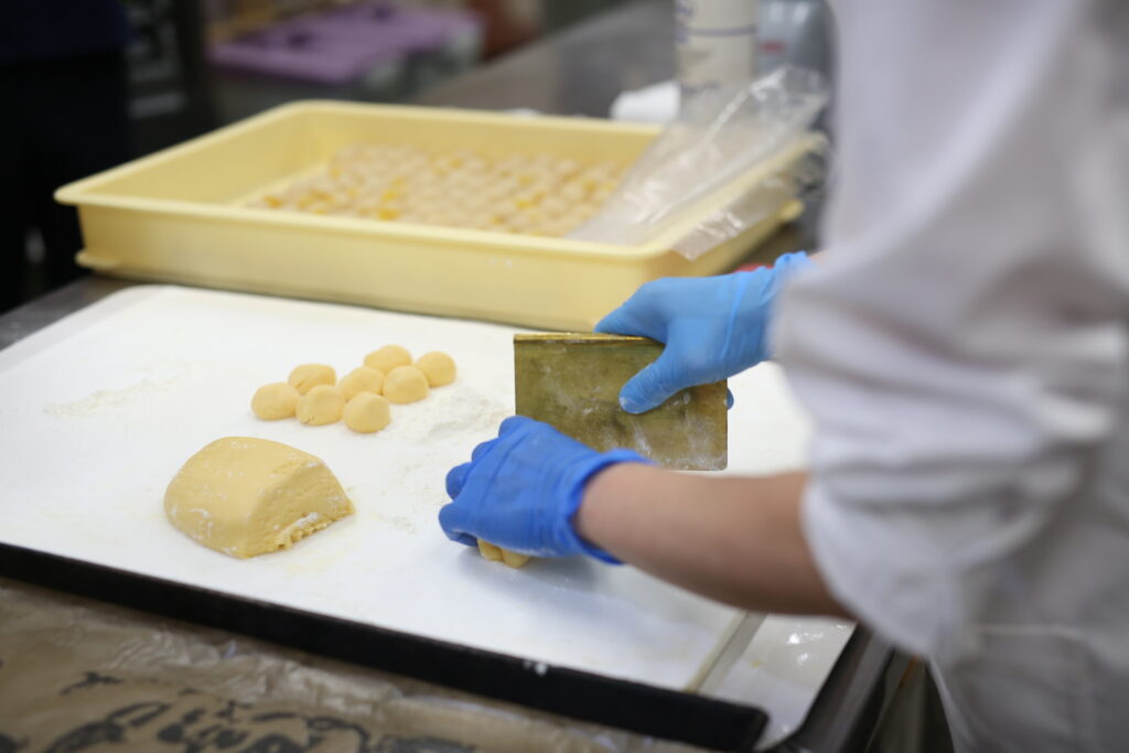ここに小麦粉を加えてこねると、たまご色のきれいな生地に。香川県産の伝統的な砂糖「和三盆」も使って、さらりとした甘さとしっとり感を生み出しています。今は甘さ控えめのお菓子が多くなっていますが、白あんは「少し甘さがある方が、人はおいしいと感じる」という先代の教えを受け継いでいます。