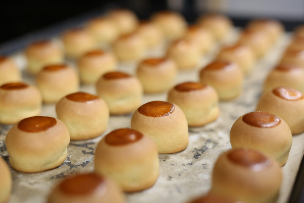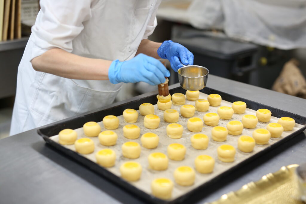 焼き始めから20分ほど経った、少しレアな状態で釜から出します。卵と砂糖の甘く、どこか懐かしい香りが厨房に広がりました。焼き上がった献上栗は、黄身を塗ったところに照りが出て、ぷっくりとした姿がかわいらしい。