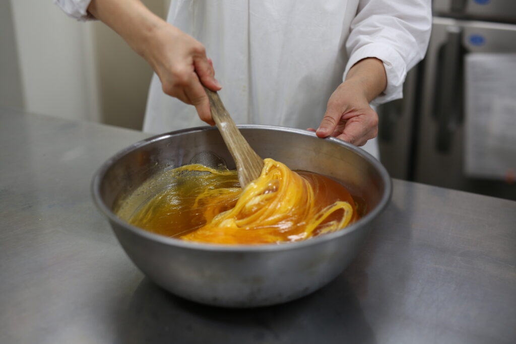 まず、卵、砂糖、水あめを加えて混ぜ合わせて、生地のもとを作ります。この生地のもとのことを、陣屋さんでは「蜜」と呼びます。黄金色とろみがかったそれは、まさに蜜。
