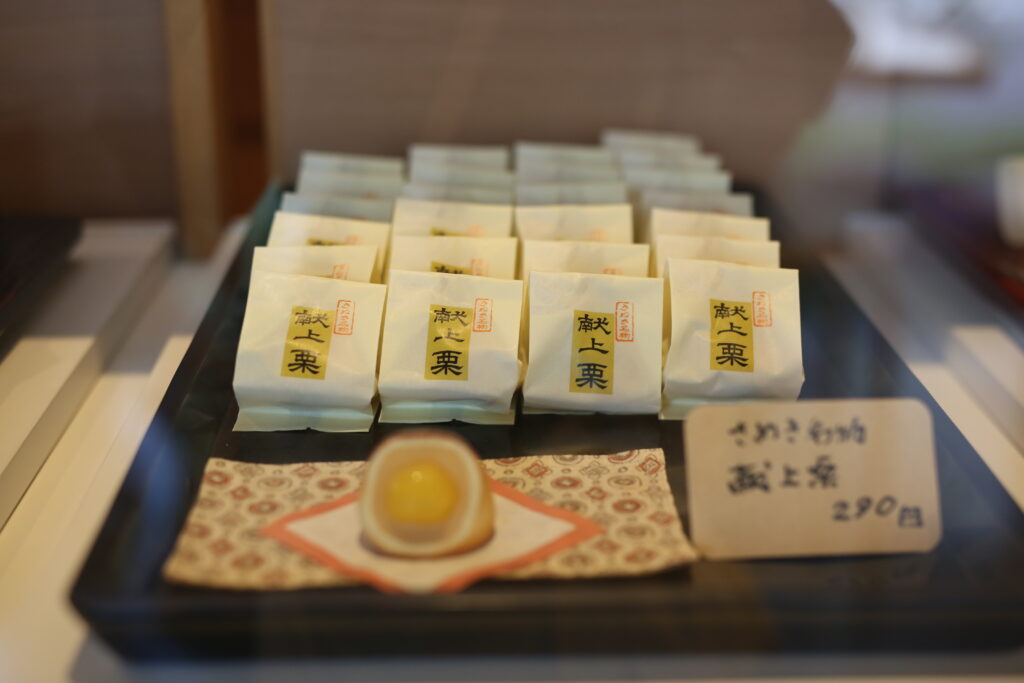 献上栗は、栗が丸ごと一粒入った白あんを薄皮で包んだ栗まんじゅうです。